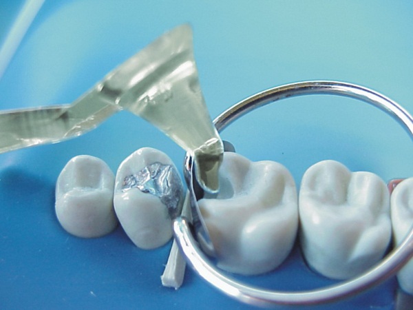 Plastinstrumentet släpper igenom härdljus när kompositet pressas mot granntanden.