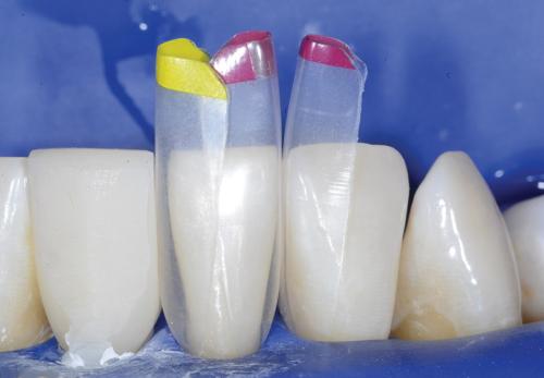 Bild: Bioclear Matrix Systems. Bioclear Black Triangle matriser kan användas för att stänga svarta trianglar, diastema och även för buckala fyllningar - då används matrisen med färgade änden vid placering i sulcus.